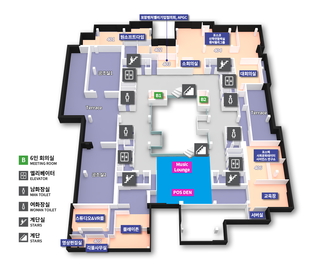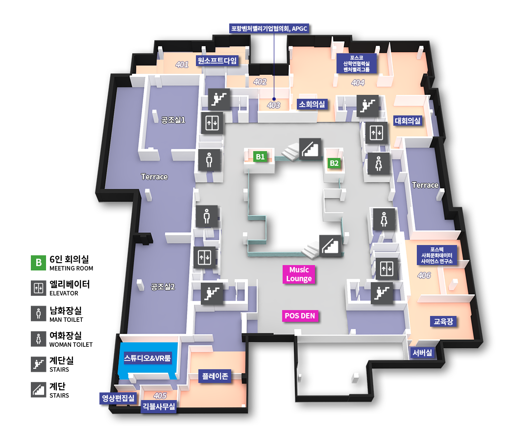 스튜디오, VR Room, 뮤직라운지, 편의 시설 등 입주사의 각종 지원 프로그램·시설 공간