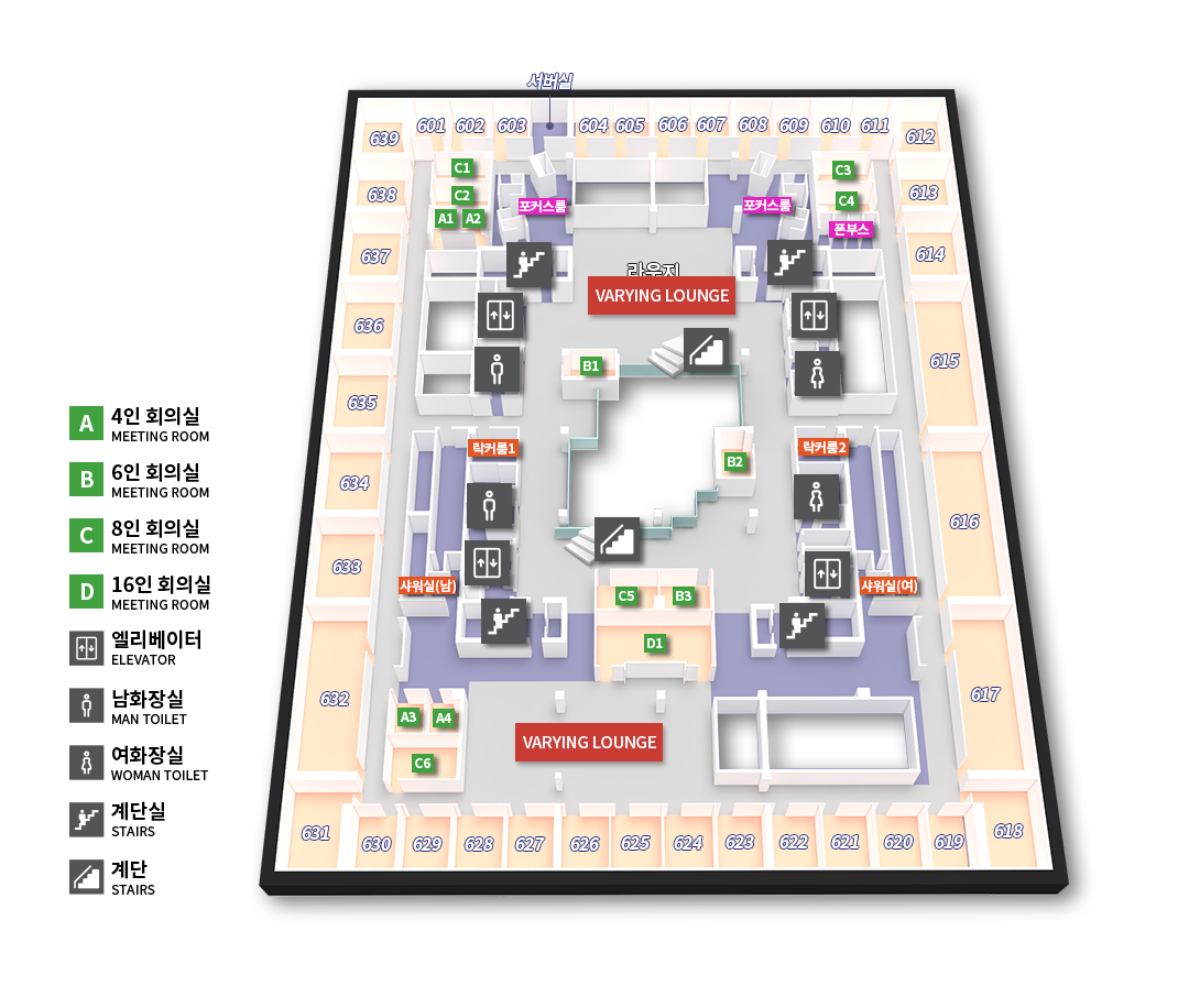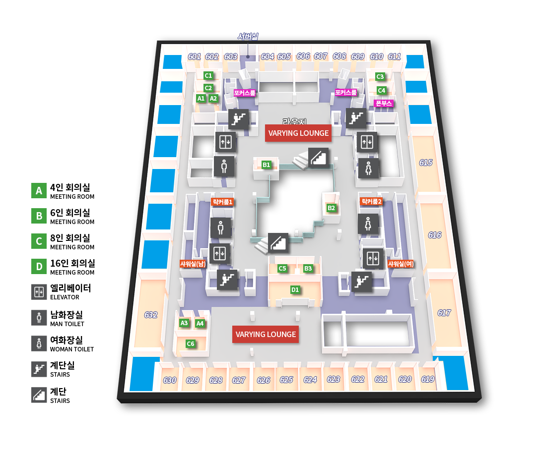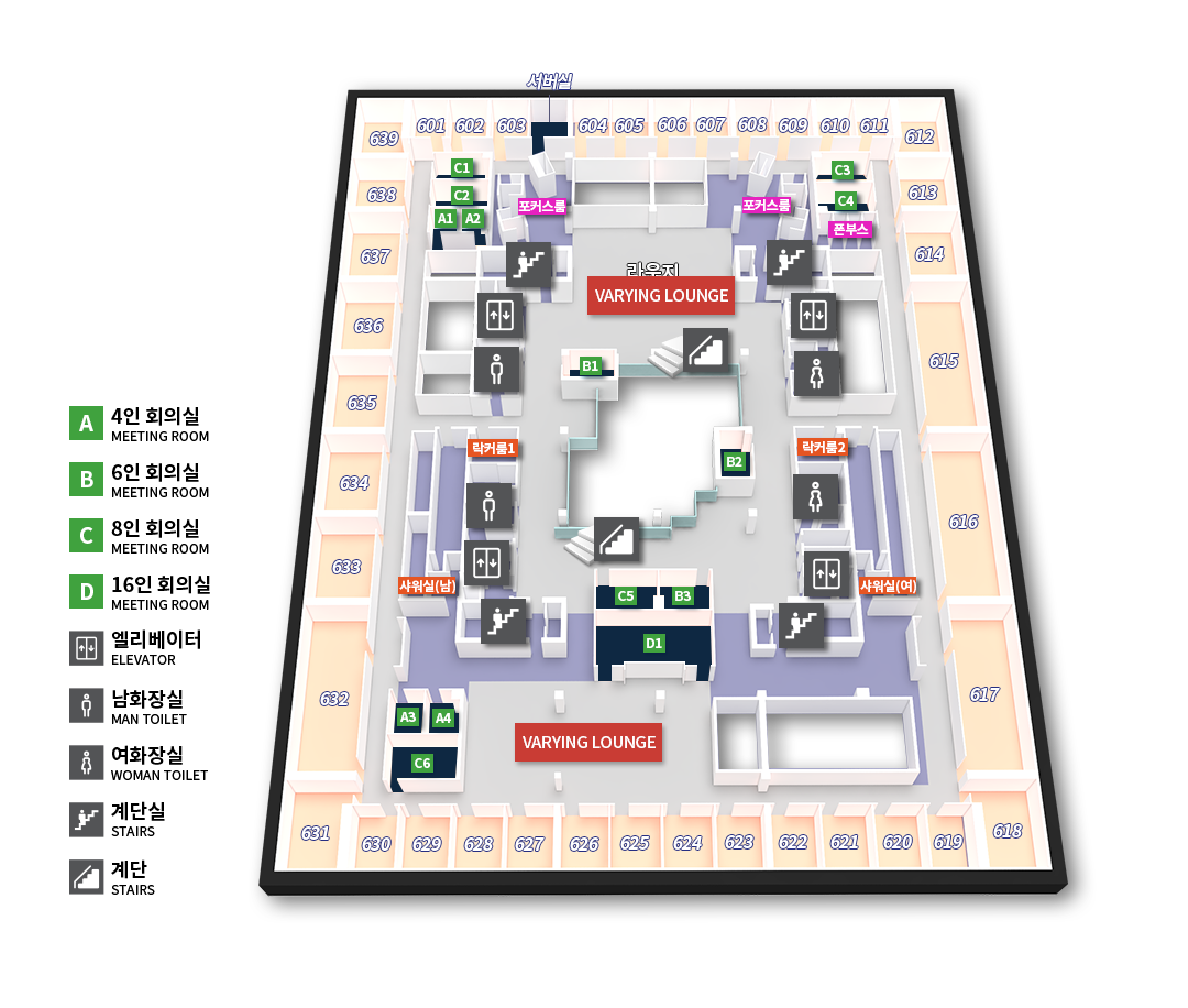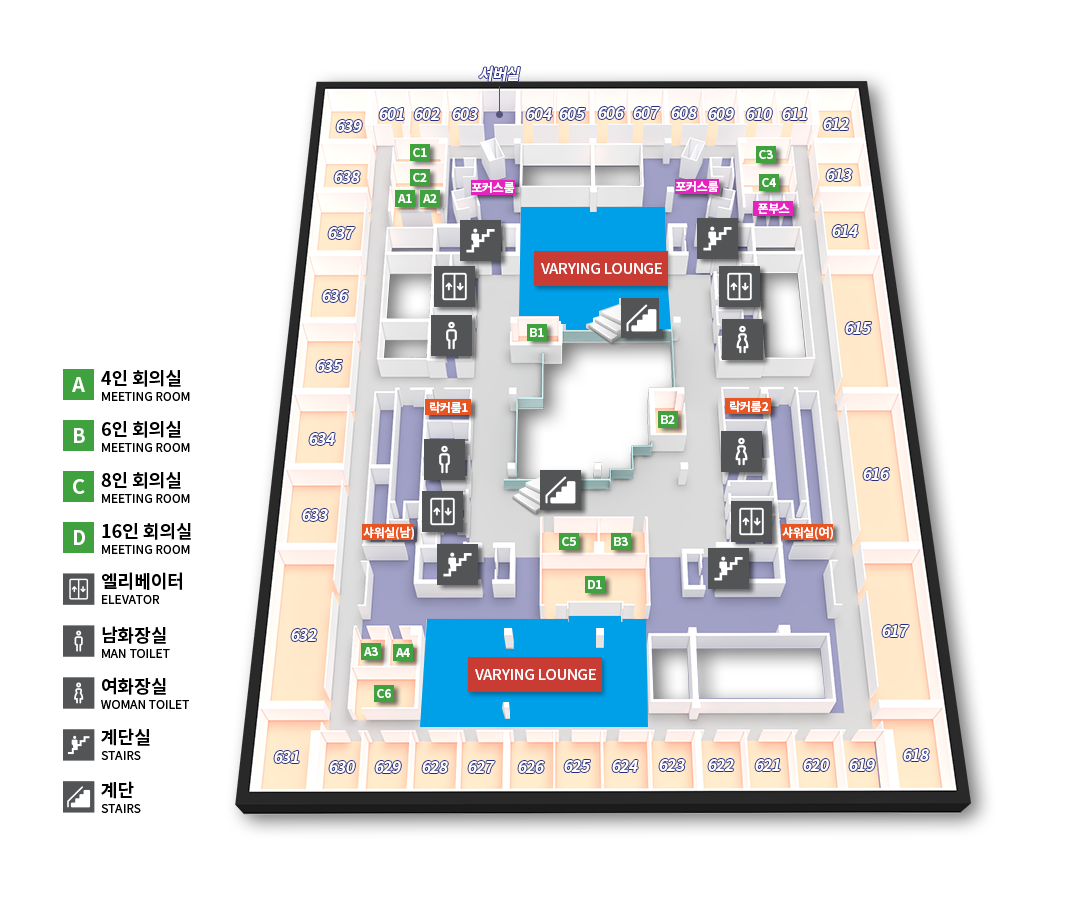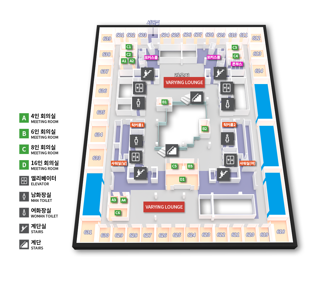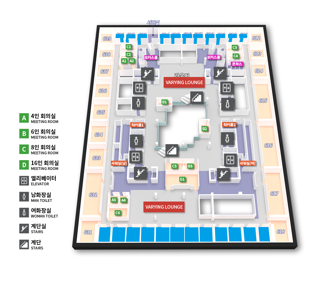 다양한 형태의 회의실 및 모임의 공간구성을 통한 소통의 오픈 라운지 조성